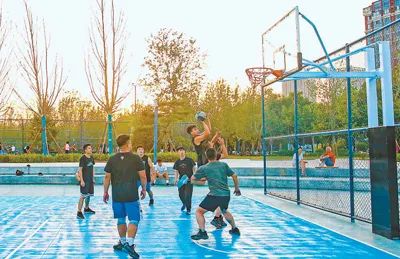 河北省石家莊市長安區拾光智慧體育公園里,市民正在打籃球。這座專業體育公園5月1日開放,以專業的運動設施和優美的健身環境,吸引眾多市民前來鍛煉。近年來,各地大力新建改建體育場地設施,為全民健身全面開展夯實基礎。